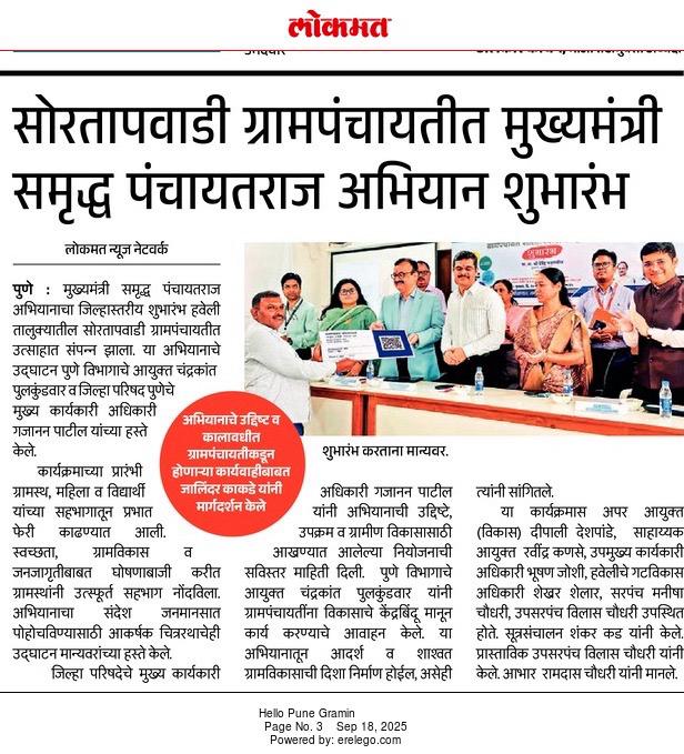 पुणे जिल्ह्यातील हवेली येथील सोरतापवाडी ग्रामपंचायत स्वच्छ, शिक्षित आणि डिजिटलदृष्ट्या सक्षम गाव निर्माण करण्यासाठी वचनबद्ध आहे. आम्ही स्वच्छता, पाणीपुरवठा, ग्रामीण रस्ते सुधारण्यावर आणि सक्रिय नागरिकांच्या सहभागाद्वारे शाश्वत विकासाला चालना देण्यावर लक्ष केंद्रित करतो.